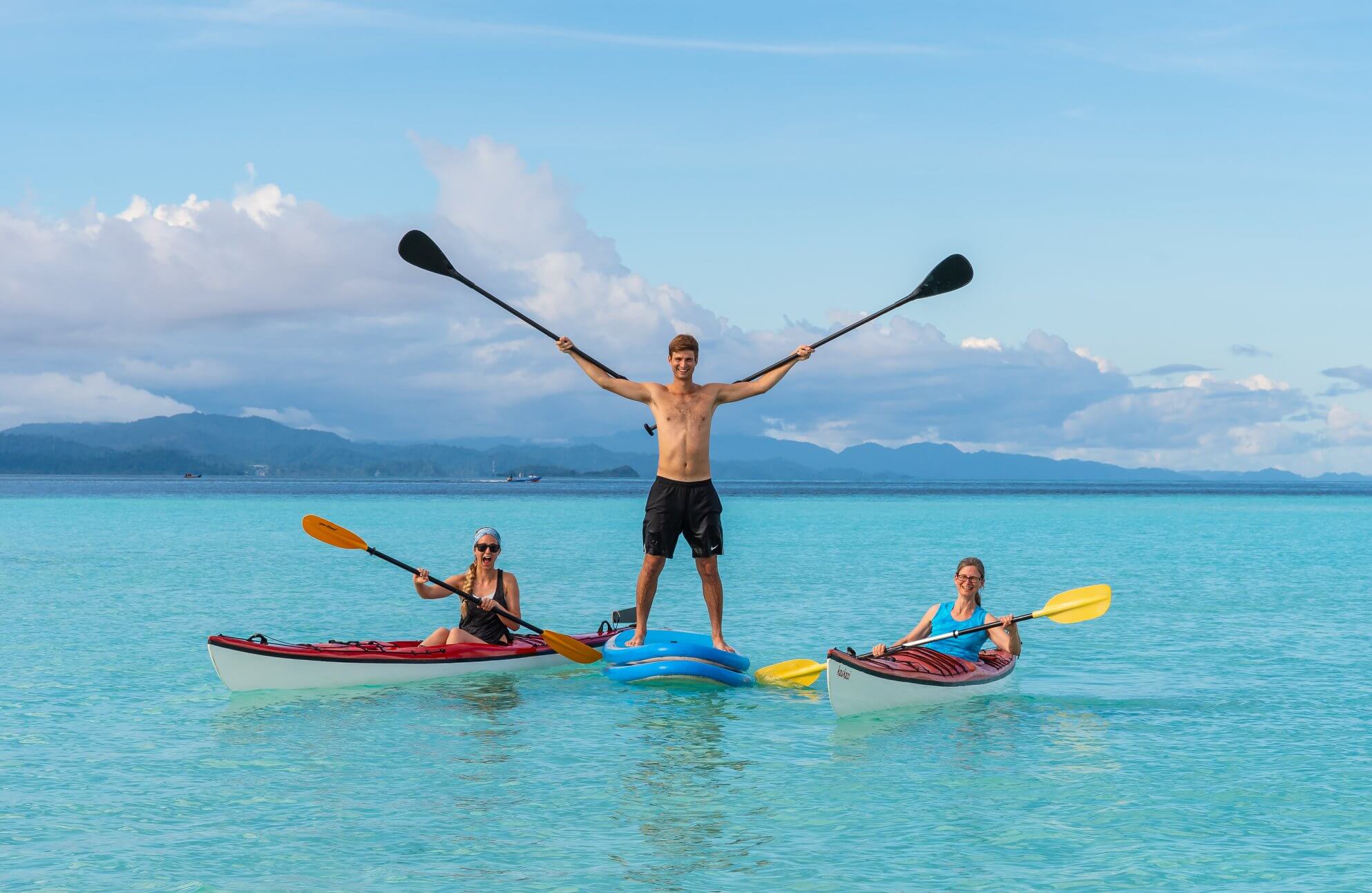Paddle through the turquoise waters of Raja Ampat to catch sunset on a remote island with our free to use kayaks and paddleboards.